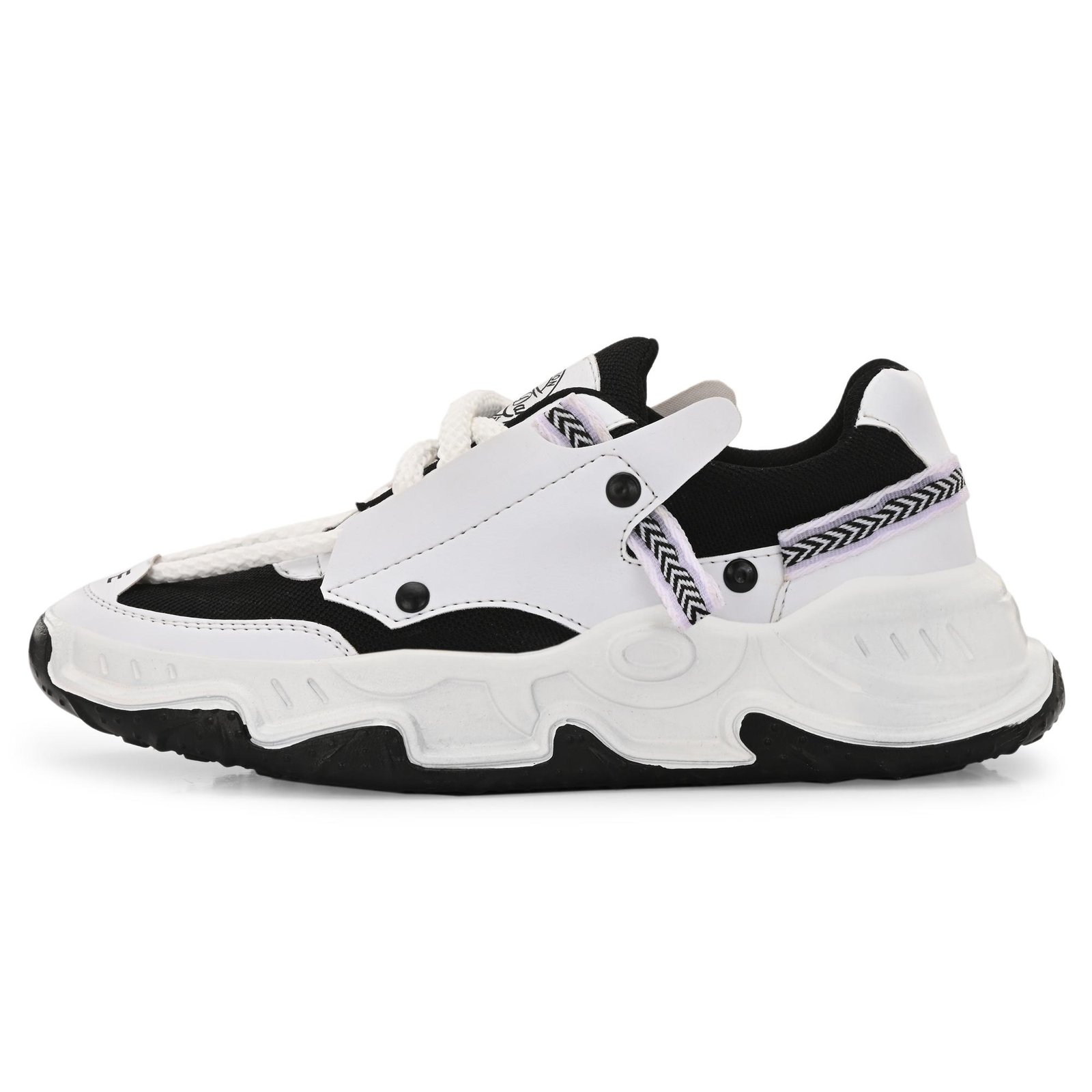 The first thing that catches the eye is the striking black and white color palette, a timeless combination that offers versatility and impact. But it's the unique details that truly set these sneakers apart. The asymmetrical design, a masterstroke of contemporary style, creates a dynamic and visually arresting look. The contrasting panels aren't just color blocks; they're thoughtfully placed to create a sense of movement and intrigue, making these shoes a conversation starter wherever you go.