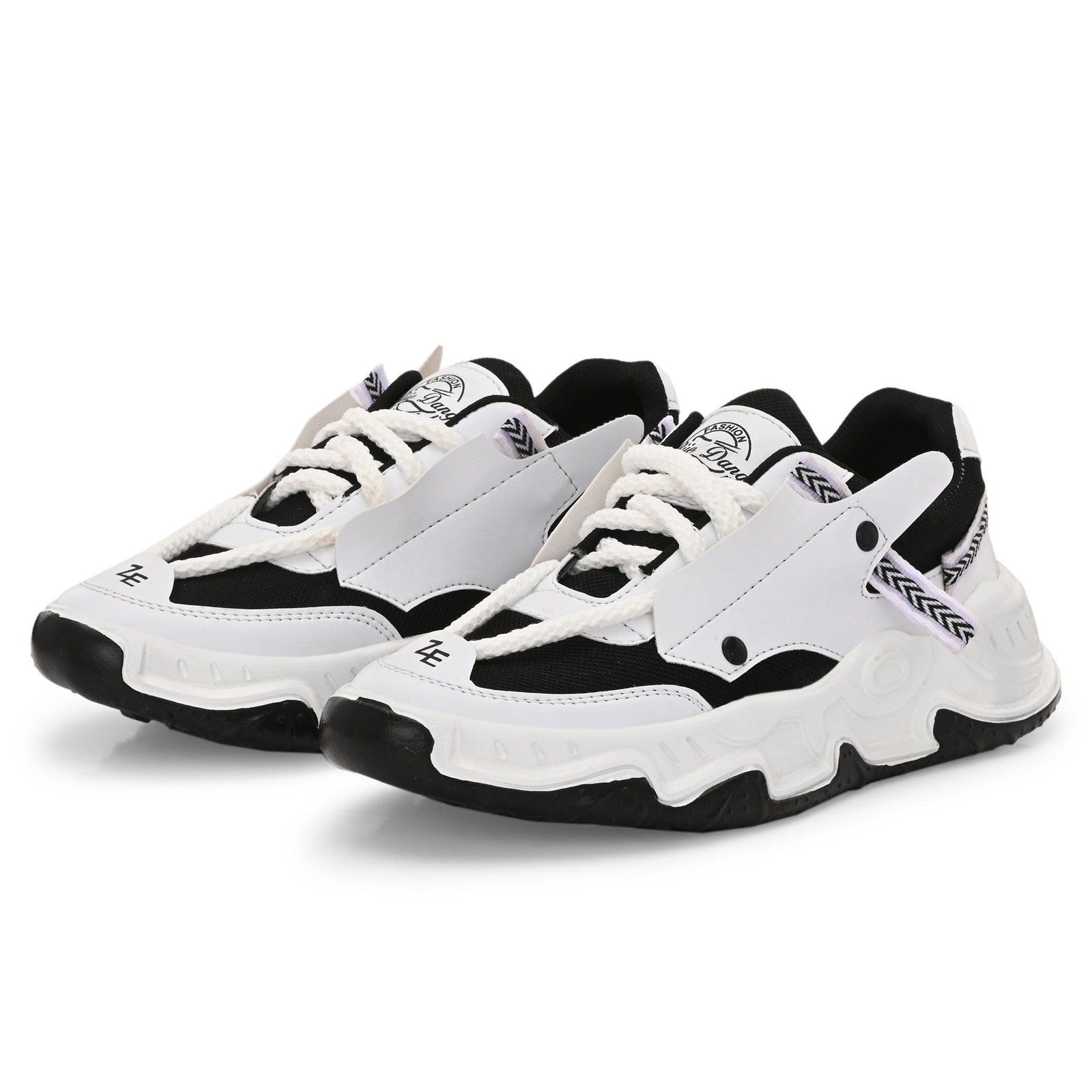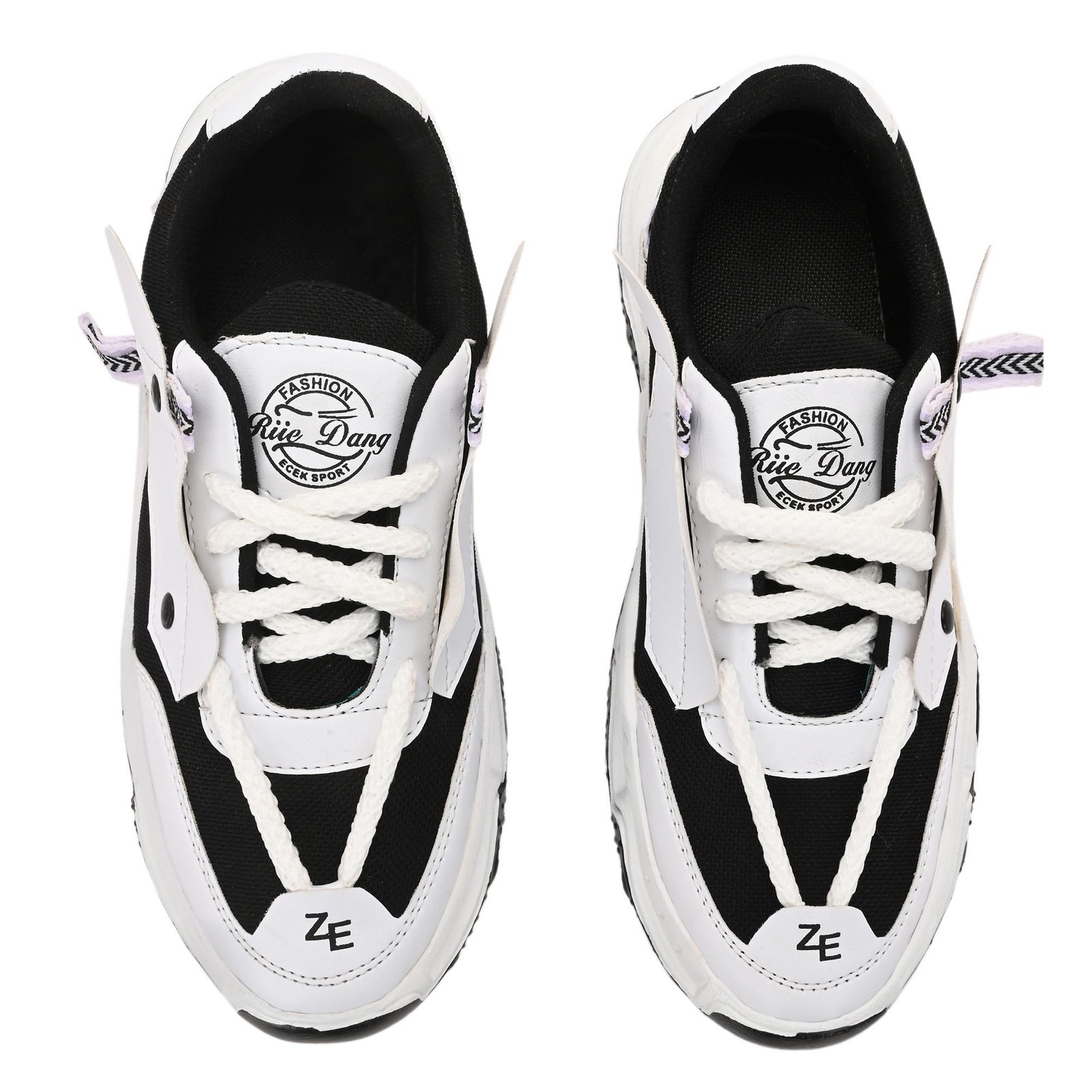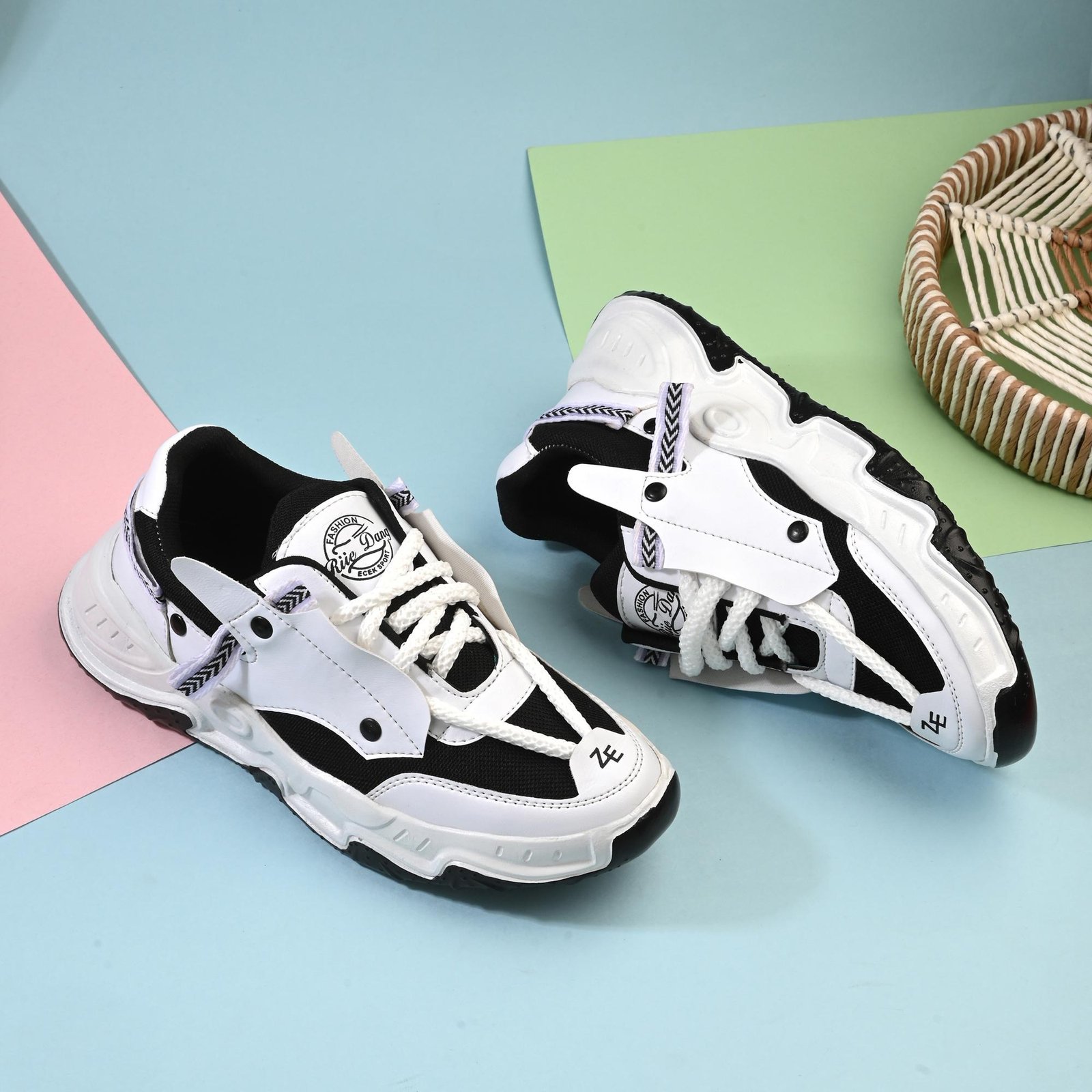 The first thing that catches the eye is the striking black and white color palette, a timeless combination that offers versatility and impact. But it's the unique details that truly set these sneakers apart. The asymmetrical design, a masterstroke of contemporary style, creates a dynamic and visually arresting look. The contrasting panels aren't just color blocks; they're thoughtfully placed to create a sense of movement and intrigue, making these shoes a conversation starter wherever you go.